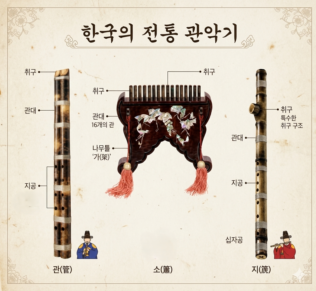 국악기 중에서도 이름은 낯설지만 그 형태와 소리는 매우 신비로운 관(管), 소(簫), 그리고 지(篪)에 대해 알아겠습니다.