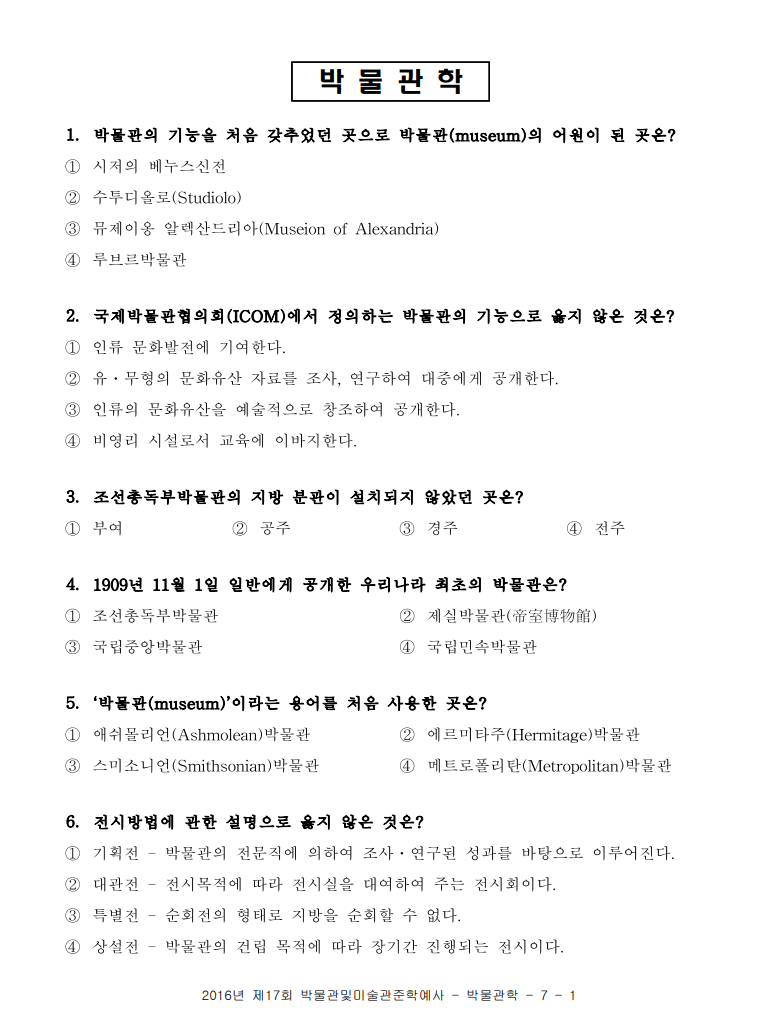 2016년 제17회 박물관 및 미술관 준학예사 박물관학 기출문제