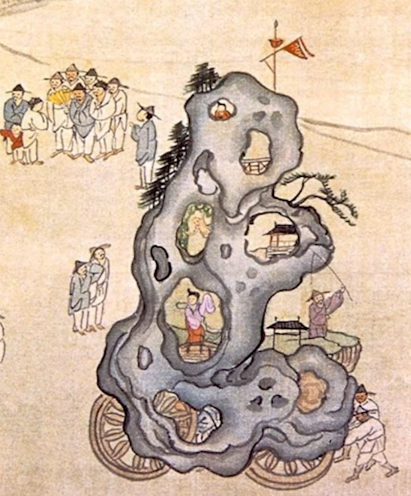 산대는 '산'의 형상을 본떠 만든 구조물로, 당시 신선이 사는 봉래산(蓬萊山)을 형상화하여 신비롭고 몽환적인 분위기를 연출했습니다.