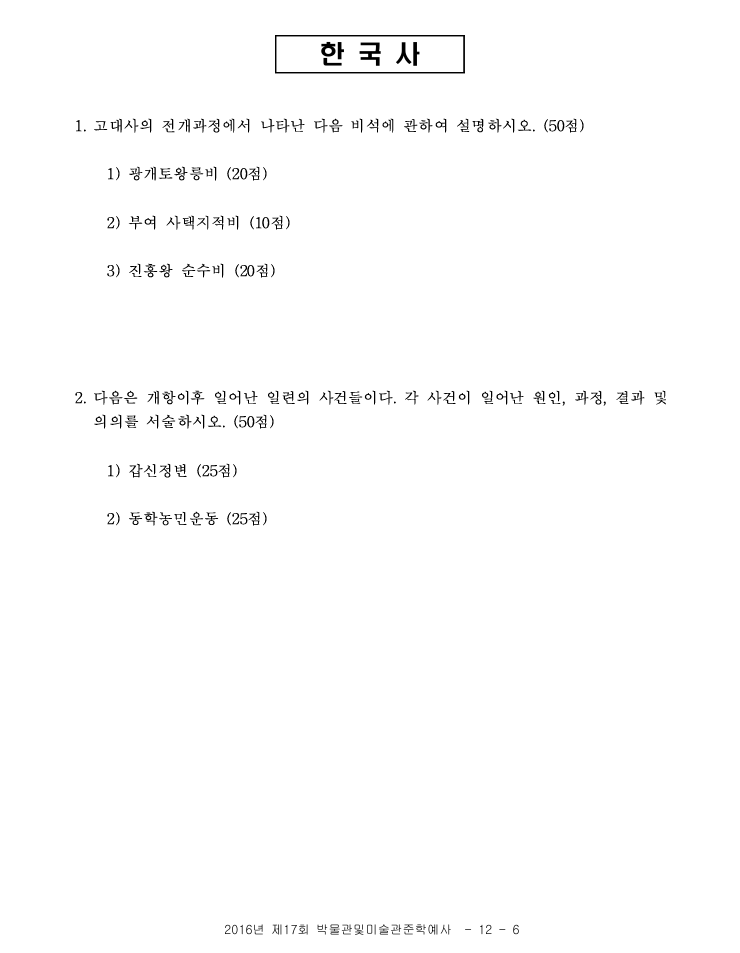 2016년 준학예사 한국사 기출문제(답안 포함)